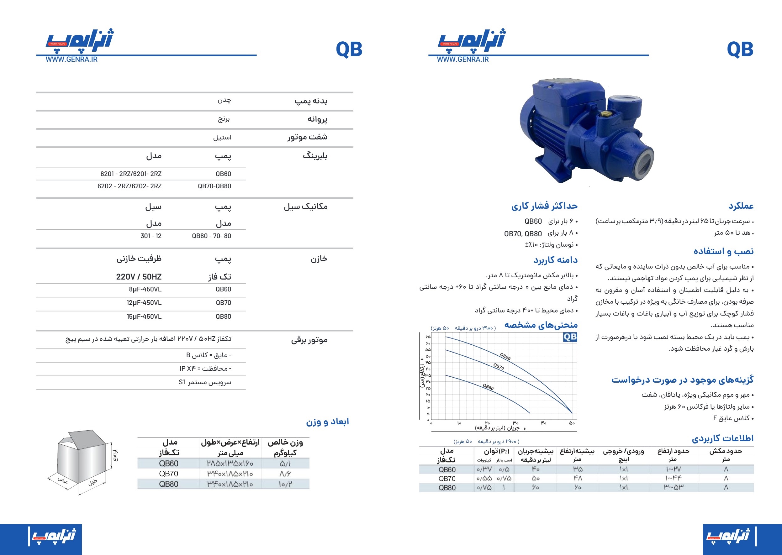 پمپ آب محیطی ژنراپمپ مدل QB70 یک پمپ خانگی 0/75اسب (توان 0.55 کیلووات) می باشد. پروانه این پمپ از جنس برنج بوده که نسبت به پمپ های با پروانه نوریل و حتی استیل دارای استحکام و خوردگی کمتر می باشد. حداکثر ارتفاع آبدهی پمپ ژنراپمپ مدل QB70 برابر 48 متر بوده که از این حیث برای ساختمان های تا سه طبقه کافی و جوابگو می باشد. همچنین حداکثر میزان آبدهی این پمپ 50 لیتر بر دقیقه است. جنس بدنه پمپ چدن و شفت آن استنلس استیل می باشد. حداکثر فشار پمپ ژنراپمپ مدل QB70 برابر 8 بار بوده و این پمپ قادر است نوسانات برق تا 10درصد 220 ولت را نیز تحمل نماید. پمپ آب محیطی ژنراپمپ مدل QB70 دارای گشتاور 2850 دور بر دقیقه می باشد. حداکثر دمای محیط باید 40 درجه سانتی گراد و حداکثر دمای سیال استفاده شده باید 60 درجه سانتی گراد باشد. همچنین پمپ آب محیطی ژنراپمپ مدل QB70 دارای قابلیت خاموش شدن پمپ در صورت اضافه جریان (Thermal Overload Protector) می باشد که این خود از سوختن سیم پیچی موتور به دلیل گیرپاژ پمپ یا خشک کارکردن پمپ جلوگیری می کند.