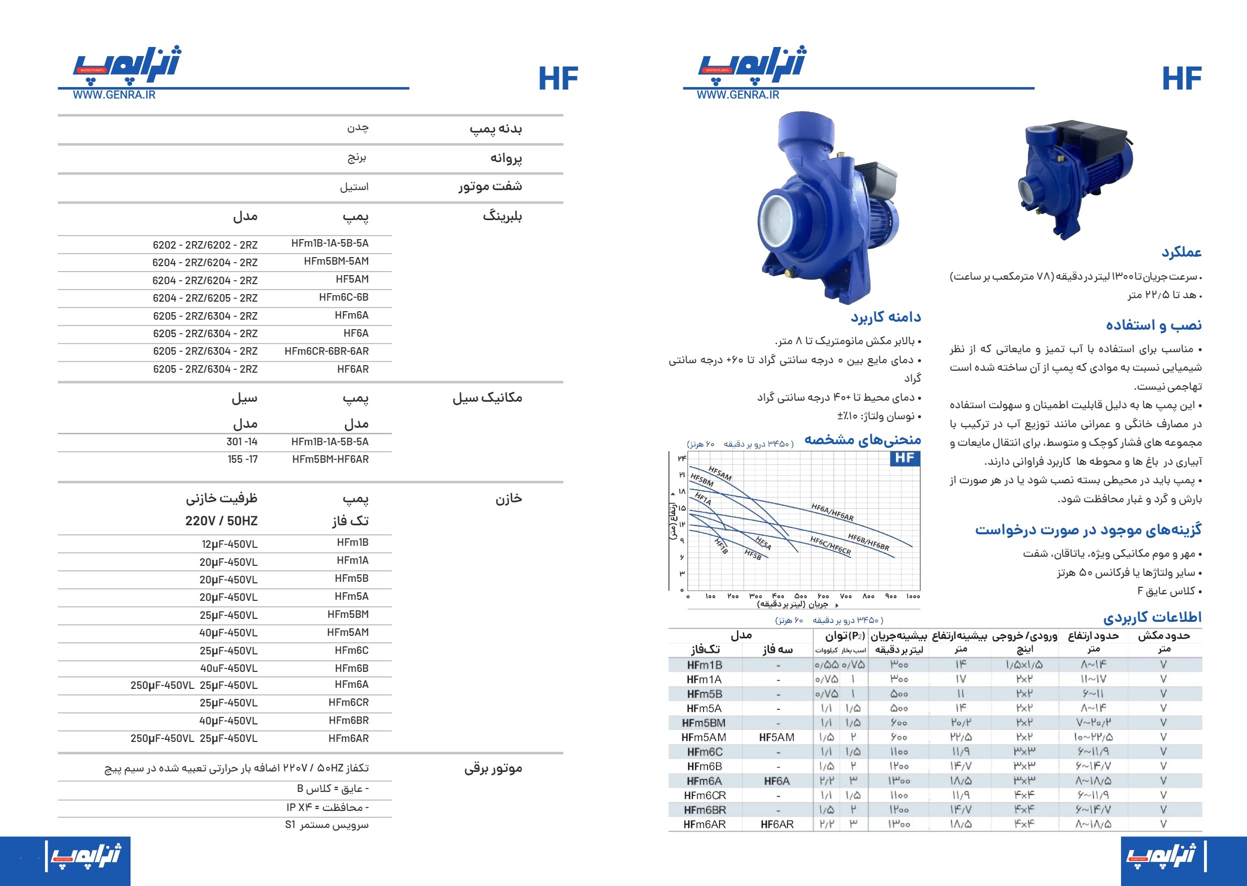 پمپ آب محیطی ژنراپمپ مدل HF5AM یک پمپ خانگی 2 اسب (توان 1/5 کیلووات) می باشد. پروانه این پمپ از جنس برنج بوده که نسبت به پمپ های با پروانه نوریل و حتی استیل دارای استحکام و خوردگی کمتر می باشد. حداکثر ارتفاع آبدهی پمپ ژنراپمپ مدل HF5AM برابر 22/5 متر بوده که از این حیث برای ساختمان های تا سه طبقه کافی و جوابگو می باشد. همچنین حداکثر میزان آبدهی این پمپ 600 لیتر بر دقیقه است. جنس بدنه پمپ چدن و شفت آن استنلس استیل می باشد. حداکثر فشار پمپ ژنراپمپ مدل HF5AMبرابر 5/5 بار بوده و این پمپ قادر است نوسانات برق تا 10درصد 220 ولت را نیز تحمل نماید. پمپ آب محیطی ژنراپمپ مدل HF5AMدارای گشتاور 2850 دور بر دقیقه می باشد. حداکثر دمای محیط باید 40 درجه سانتی گراد و حداکثر دمای سیال استفاده شده باید 60 درجه سانتی گراد باشد. همچنین پمپ آب محیطی ژنراپمپ مدل HF5AMدارای قابلیت خاموش شدن پمپ در صورت اضافه جریان (Thermal Overload Protector) می باشد که این خود از سوختن سیم پیچی موتور به دلیل گیرپاژ پمپ یا خشک کارکردن پمپ جلوگیری می کند.